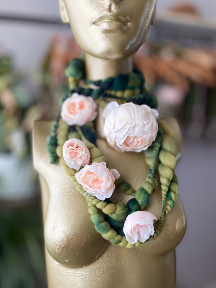 A nice bubbly ply with hand dyed fine merino with fabric flowers.
