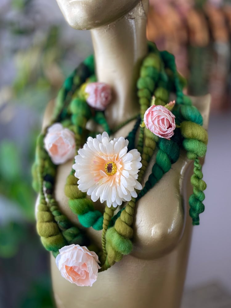 A nice bubbly ply with hand dyed fine merino with fabric flowers.
