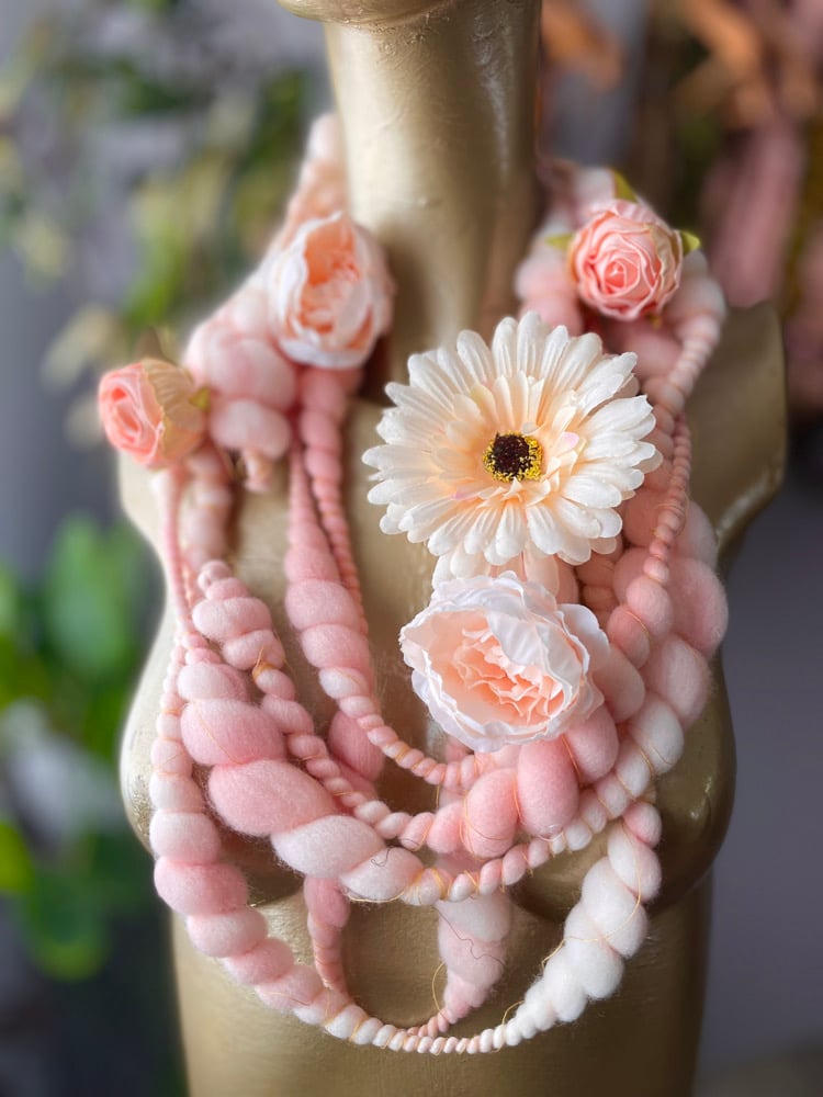 A nice bubbly ply with hand dyed fine merino with fabric flowers.